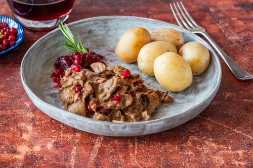 - Tillbehör: Kokt eller pressad potatis och rårörda lingon.